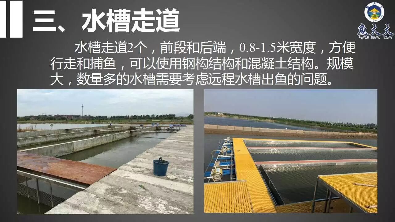 水槽走道2个,前段和后端,0.8-1.5米宽度,方便行走和捕鱼,可以使用钢构结构和混凝土结构。规模大,数量多的水槽需要考虑远程水槽出鱼的问题。