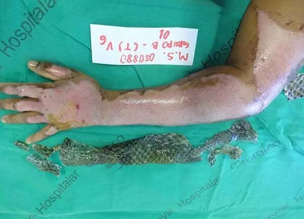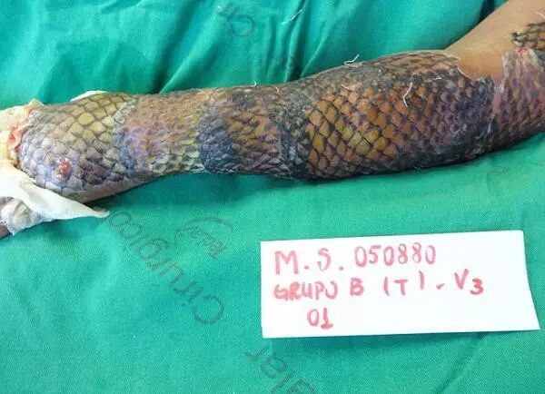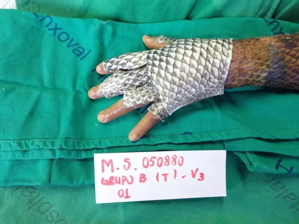 据悉,这是科学家用鱼皮为烧伤病人治疗的第一次尝试。专家称鱼皮具有抗病功能,可以降低感染率,舒缓疼痛,并如石膏一般起到固定的作用。