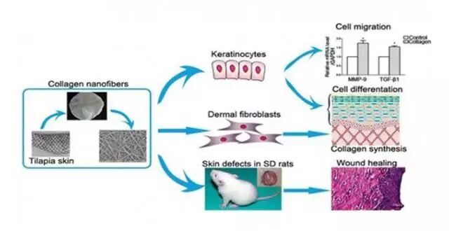 2015年,一项主题名为“仿生罗非鱼胶原蛋白纳米纤维诱导角质细胞分化为皮肤再生和真皮胶原蛋白纤维细胞合成”的实验,解释了罗非鱼的鱼鳞和皮肤通过蛋白质可以加速实验室白鼠的伤口愈合。