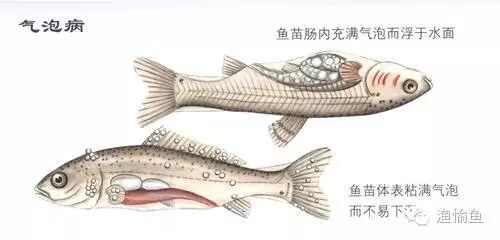 一般发生在投苗后的15天,晴天中午下午最为常见。原因是因为由于水中某种气体过饱和,鱼的肠道出现气泡(腹部可见撑红、透明状),或体表、鳃上附着着许多小气泡,使鱼体上浮或游动失去平衡,失去摄食能力最后精疲力竭死亡。发现及时死亡30%左右,严重90%以上。
