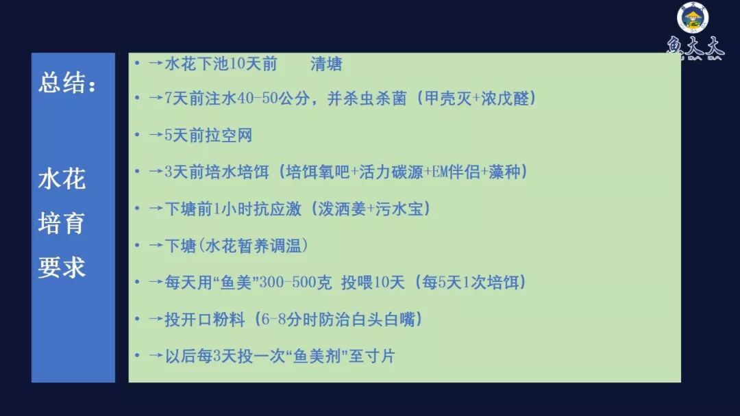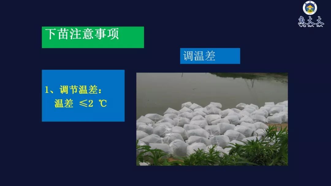 下苗的注意事项:1、调节温差,温差不超过2度;2、暂养池暂养;3、饱食下塘;4、抗应激及防治气泡病。水花培育的要求请参照下面这张图。