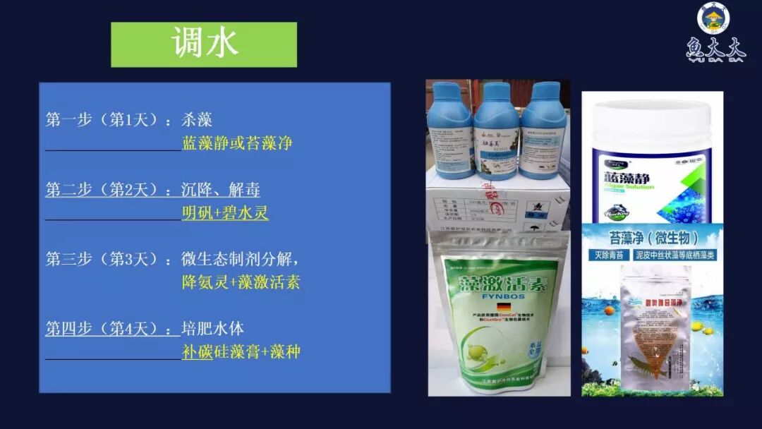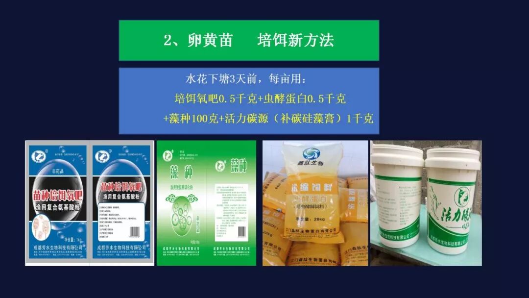卵黄苗培饵的新方法:水花下塘3天前,每亩用培饵氧吧0.5千克+虫酵蛋白0.5千克 +藻种100克+活力碳源(补碳硅藻膏)1千克。下池前使用水霉净+苗种免疫浸泡剂+泼洒姜。水花喂养新产品用鱼美剂+虫酵蛋白替代以往的豆浆,下面这张图讲了鱼美的用法与用量。