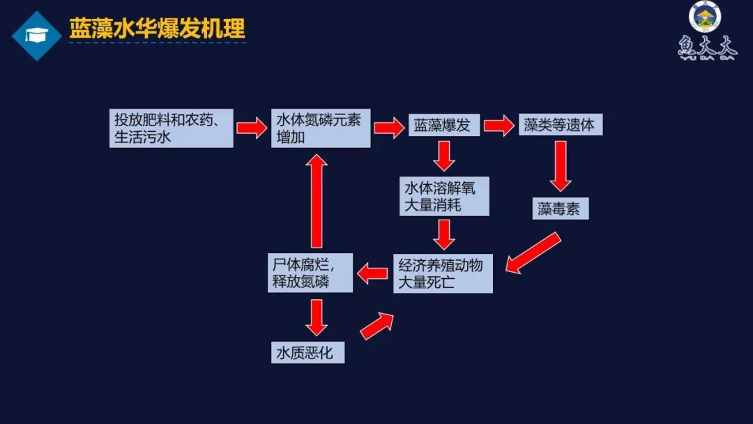 3、蓝藻水华爆发的机理:池塘中投放的肥料和农药、排放的生活污水等导致水体氮磷含量增加,导致蓝藻爆发;蓝藻爆发之后,会大量消耗水体溶解氧,同时藻类释放的藻毒素,也会导致鱼儿大量死亡,腐烂的鱼儿也会释放氮磷,导致水质恶化,又会引起鱼儿死亡,这是一个恶性循环过程。