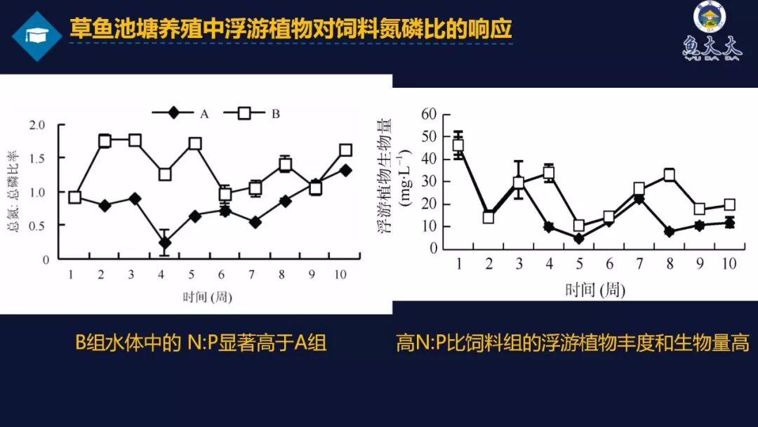 1)高氮磷比饲料的池塘中具有更多的浮游植物丰度和生物量。