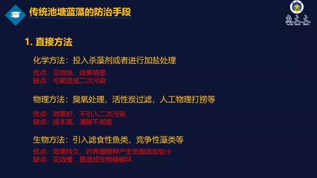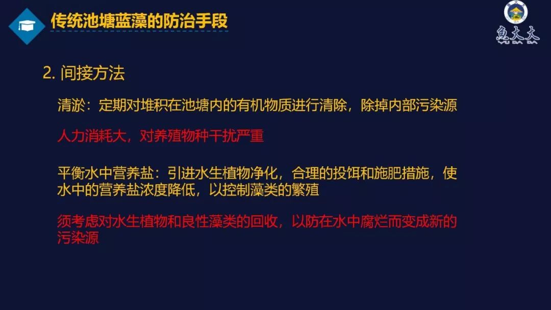 3)生物方法:引入滤食性鱼类,如花白鲢、竞争性藻类等,但见效慢。