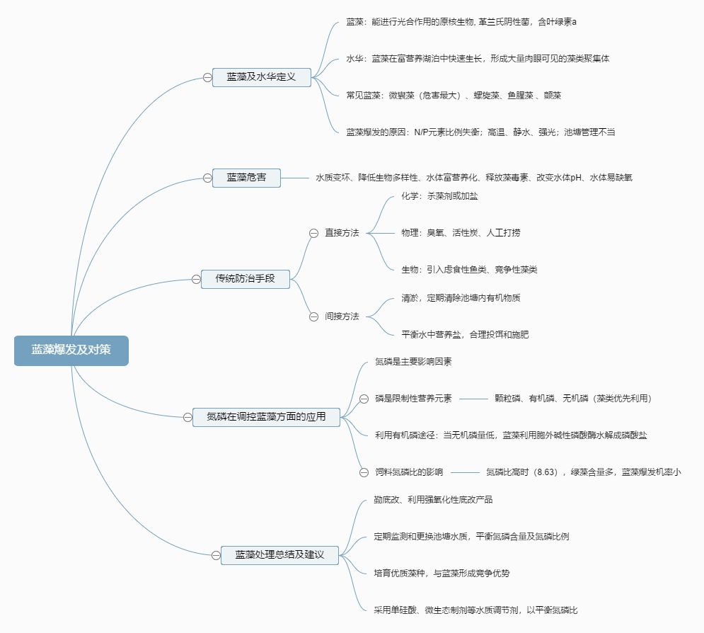 1、蓝藻爆发的原因:水体氮磷元素大量存在且比例失衡;高温、静水、强光条件刺激蓝藻增殖爆发;养殖池塘管理不当等等。