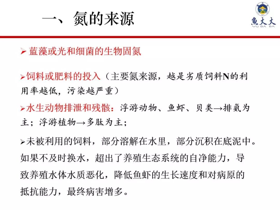 主要有三种途径:蓝藻或光和细菌的生物固氮;饲料或肥料的投入(是氮的主要来源,越是劣质饲料N的利用率越低,污染越严重);水生动物排泄和残骸。
