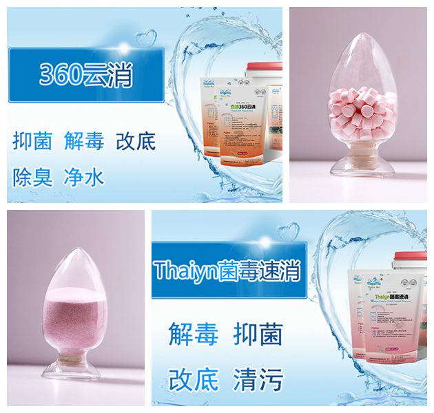 上图为上海泰缘生产的360云消和菌毒速消(均为50%有效含量)