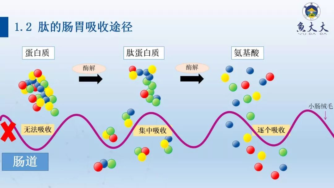 其实我们每天都在和肽打交道,比如鱼饲料,饲料中的蛋白质不能被鱼体直接吸收利用,而是要经过一步一步的酶解分解出氨基酸,分解后的氨基酸一部分被直接用来合成新的蛋白质,一部分被氧化分解。这样由蛋白质分解成氨基酸再合成新的蛋白质的过程不仅增加了鱼机体能量的消耗,而且使原本蛋白质的功能性被破坏。而小分子肽可以被鱼体直接吸收利用。