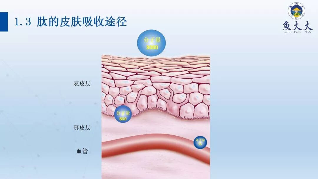 小分子肽除了可以被肠道吸收以外,还可以被皮肤直接吸收。分子量大于3000的物质被阻挡在皮肤外部,分子量小于等于800的可进入真皮层,分子量小于等于75的可直接进入血管。杨军博士开发的小分子肽产品分子量几乎都在500以下,可迅速激活表皮细胞和真皮层的成纤维母细胞,加快合成胶原蛋白,为鱼体补充营养。