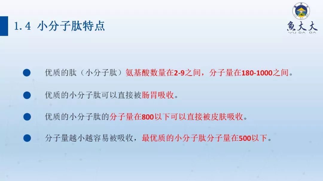 优质的肽(小分子肽)氨基酸数量在2-9之间,分子量在180-1000之间;小分子肽可以直接被肠胃吸收;小分子肽的分子量在800以下可以直接被皮肤吸收;最优质的小分子肽分子量在500以下。