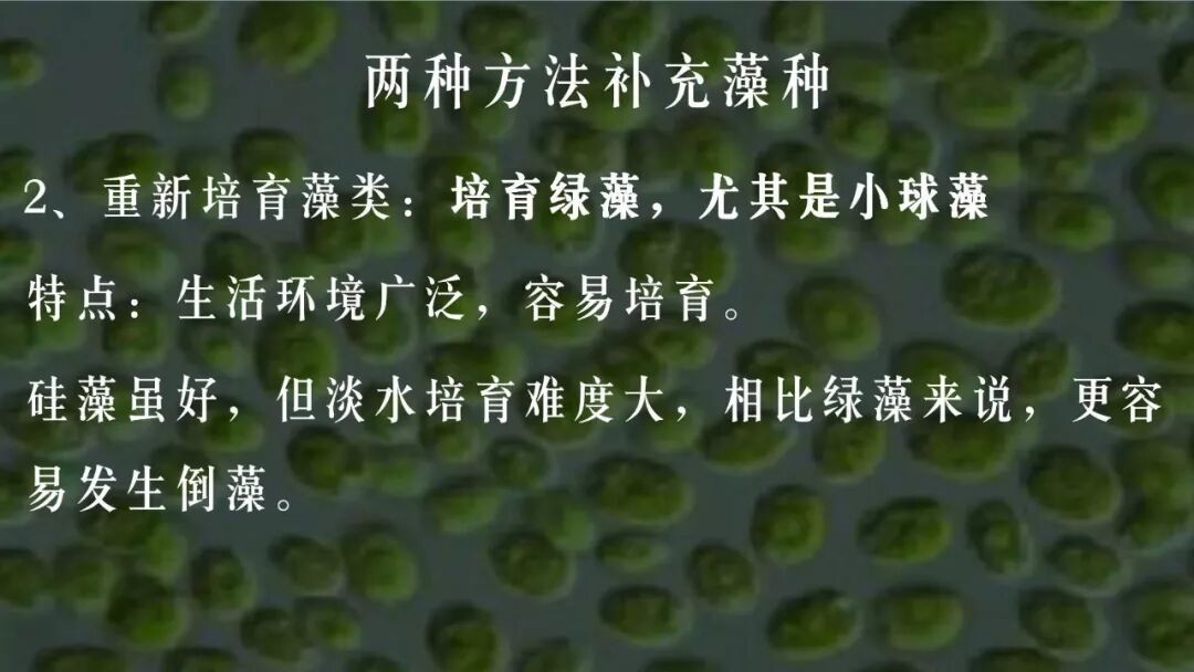 第二种:如果没有条件引种,就要使用培藻的投入品,建议大家培育绿藻,尤其绿藻中的小球藻,为什么呢?因为绿藻生存的环境更广泛,更容易培育起来,硅藻是很好,但是广泛生活于咸水及咸淡水,淡水培育硅藻困难很大,同时硅藻的生命周期比较短,相对于绿藻,硅藻更容易发生倒藻。