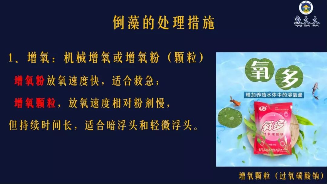 打开增氧机或者使用增氧粉和增氧颗粒。如果出现比较严重的缺氧浮头有翻塘的风险,此时应该选择增氧粉,因为粉剂增氧剂放氧速度很快,在短时间内迅速放氧,适合救急;颗粒增氧剂,放氧速度相对较慢,但是持续时间比粉剂的久,适合暗浮头和轻微浮头。