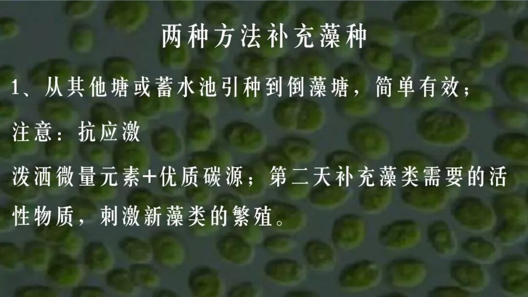 第一种方法:从其他塘或蓄水池引种到倒藻塘,如果你的养殖场有其他池塘,并且不是有害藻类,完全可以将这个池塘的水抽一部分过去,从晴天上午开始引种,一直持续到太阳落山都可以。要注意藻类抗应激,可以预先泼洒微量元素+优质碳源进行缓解,引种以后,在第二天上午补充藻类需要的活性物质,不断刺激新的藻类繁殖。
