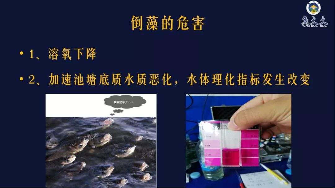 水体中的氧气多数是藻类光合作用产生,当藻类大量死亡,溶氧的来源被切断,同时死亡的藻类反而会消耗原有池塘的溶氧;严重时会引起鱼虾缺氧浮头,甚至是翻塘,所以管理好水质很重要。