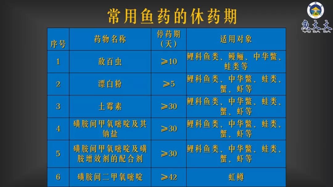 2、不遵守休药期规定。休药期的长短与药物在动物体内的消除率和残留量有关,而且与动物种类,用药剂量和给药途径有关。国标渔药中,除中草药类、维生素类、促生长剂等无休药期,其它产品都有休药期。