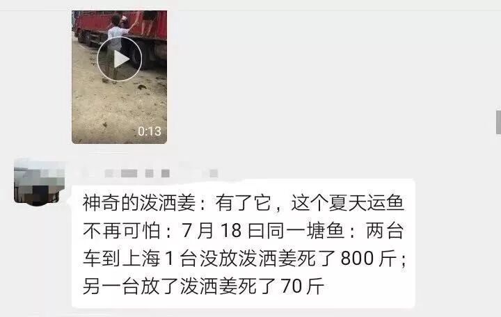 广东黑鱼流通商朋友说:装鱼前每立方水张老师的正规泼洒姜50-80克,效果很明显!7月18曰同一塘鱼,两台车到上海1台没放泼洒姜死了800斤;另一台放了泼洒姜死了70斤。