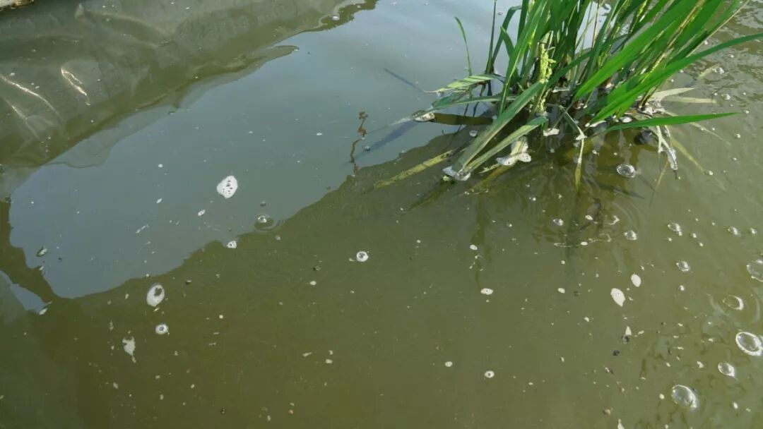 这就是夏大哥的养殖池,水体发绿、发臭,看不到水底、水蛭苗大小不一,并且死亡率高。