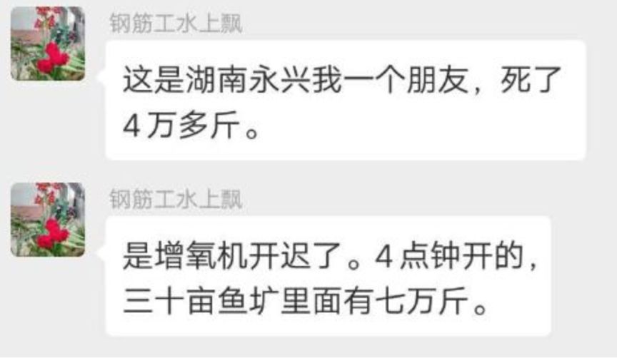 凌晨4点钟的时候赶到塘边手动开启增氧机,不过遗憾的是,还是太迟了,导致缺氧死鱼4万多斤,直接经济损失二十多万