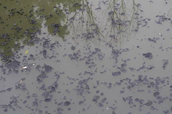 4.观察水体是否有冒泡现象(注意区分增氧机打起的泡泡)——这已经比较严重了。区分增氧机打起的泡沫以及水体中冒起来的泡沫。